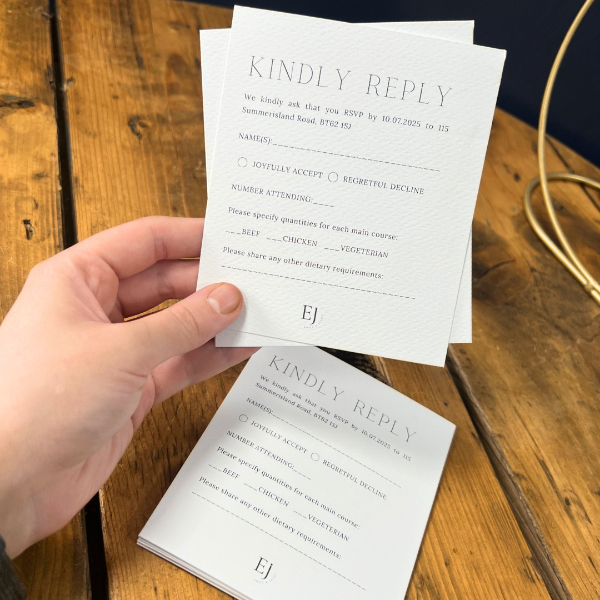 Ensure your guests can respond effortlessly to your wedding invitations with our personalised RSVP cards! Designed to complement your wedding stationery, these cards can include your telephone number or email address for quick replies, or your postal address for a traditional touch.